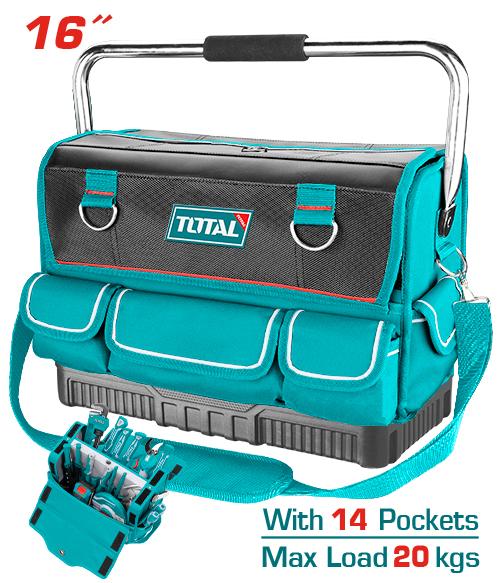 Kích thước: 16 inch, 14 túi đựng dụng cụ. Thiết kế Mở hai bên dễ dàng sử dụng. Chất liệu: 600D polyester & Chất liệu chống ẩm cho các mặt , Tải trọng tối đa : 20kg.Mẫu tay cầm mềm tạo sự thoải mái khi sử dụng Tay cầm bằng thép chắc chắn và dây đeo vai để dễ dàng mang theo Đế nhựa gia cố chắc chắn, Đóng gói bằng thẻ giấy. 4/T